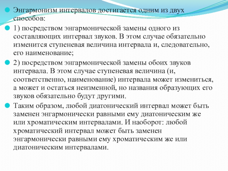 Таким образом, любой диатонический интервал может быть заменен энгармонически равными ему диатоническим же или хроматическим интервалами. И наоборот: любой хроматический интервал может быть заменен энгармонически равными ему хроматическим же или диатоническим интервалами.