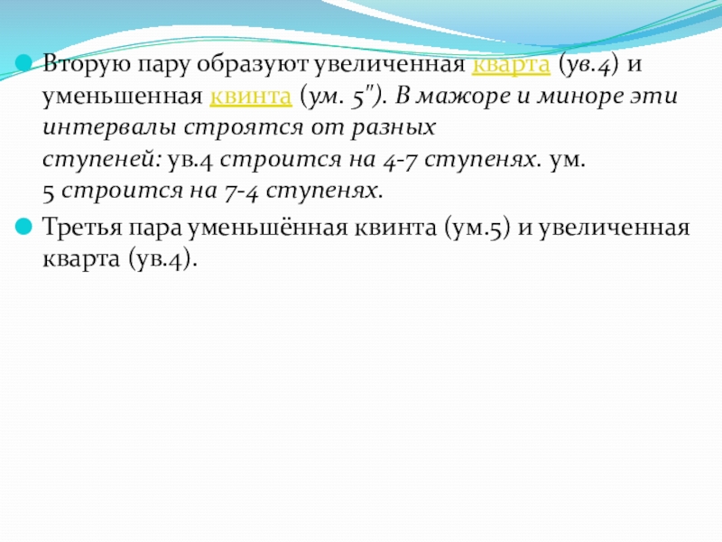 Слайд 15Вторую пару образуют увеличенная кварта (ув.4) и уменьшенная квинта (ум. 5"). В мажоре и миноре эти