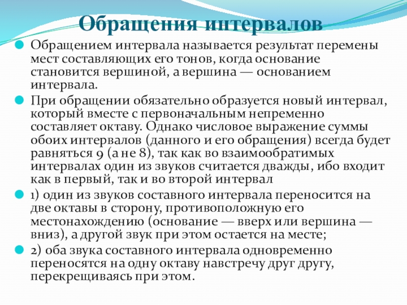 При обращении обязательно образуется новый интервал, который вместе с первоначальным непременно составляет октаву. Однако числовое выражение суммы обоих интервалов (данного и его обращения) всегда будет равняться 9 (а не 8), так как во взаимообратимых интервалах один из звуков считается дважды, ибо входит как в первый, так и во второй интервал