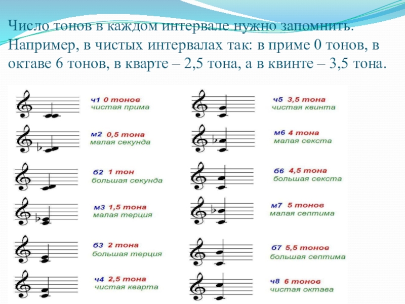 Слайд 10Число тонов в каждом интервале нужно запомнить. Например, в чистых интервалах