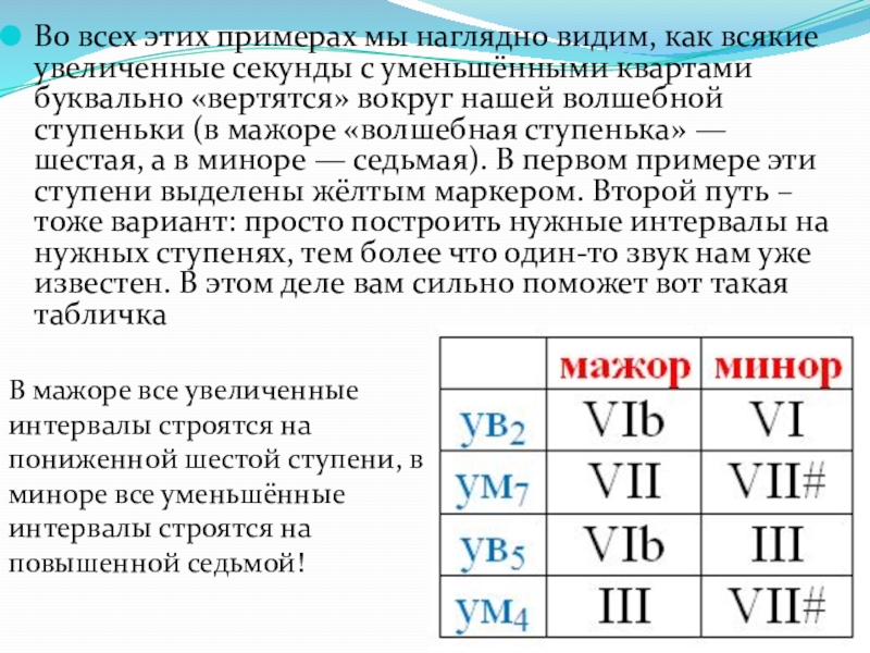 с уменьшёнными квартами буквально «вертятся» вокруг нашей волшебной ступеньки (в мажоре «волшебная ступенька» — шестая, а в миноре — седьмая). В первом примере эти ступени выделены жёлтым маркером. Второй путь – тоже вариант: просто построить нужные интервалы на нужных ступенях, тем более что один-то звук нам уже известен. В этом деле вам сильно поможет вот такая табличка