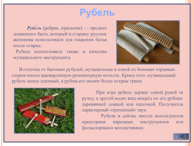 В отличие от бытовых рубелей, музыкальные в одной из боковых торцевых сторон имели высверленную резонаторную полость. Кроме того, музыкальный рубель менее длинный, а рубцы его имеют более острые грани.