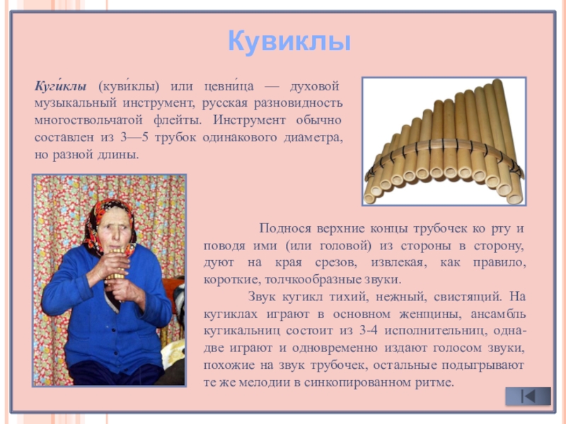 Куги́клы (куви́клы) или цевни́ца — духовой музыкальный инструмент, русская разновидность многоствольчатой флейты. Инструмент обычно составлен из 3—5 трубок одинакового диаметра, но разной длины.