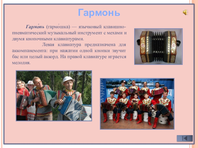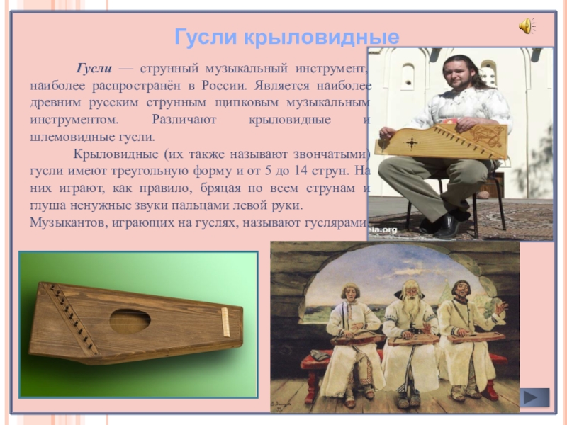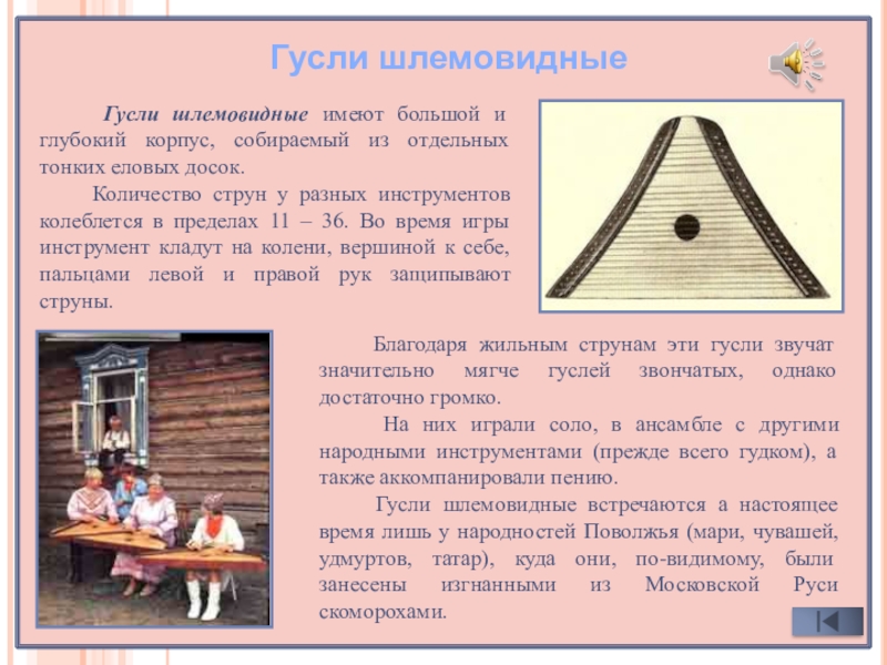 Гусли шлемовидные встречаются а настоящее время лишь у народностей Поволжья (мари, чувашей, удмуртов, татар), куда они, по-видимому, были занесены изгнанными из Московской Руси скоморохами.