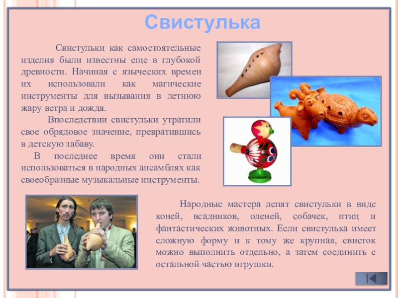 Народные мастера лепят свистульки в виде коней, всадников, оленей, собачек, птиц и фантастических животных. Если свистулька имеет сложную форму и к тому же крупная, свисток можно выполнить отдельно, а затем соединить с остальной частью игрушки.