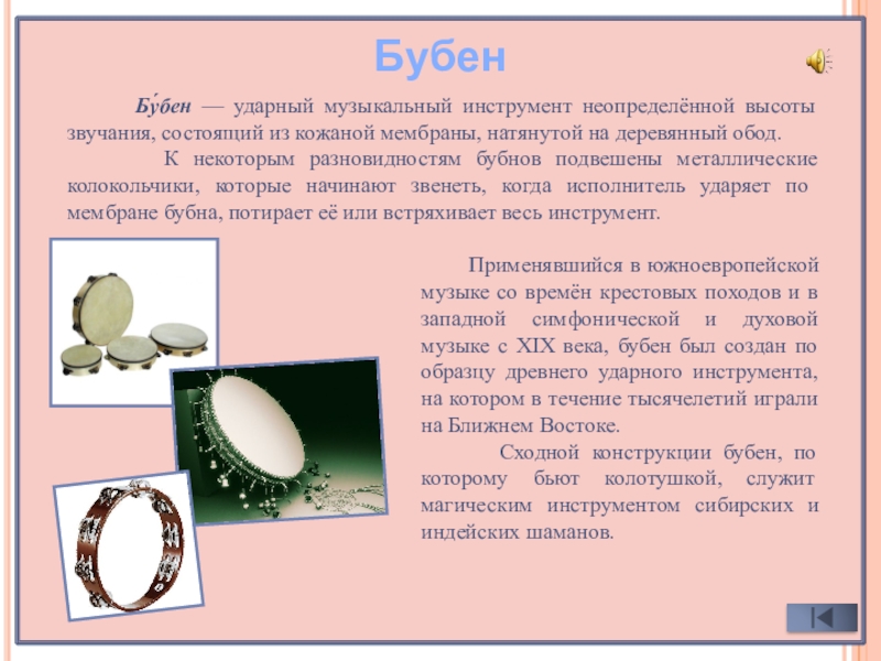 Применявшийся в южноевропейской музыке со времён крестовых походов и в западной симфонической и духовой музыке с XIX века, бубен был создан по образцу древнего ударного инструмента, на котором в течение тысячелетий играли на Ближнем Востоке.