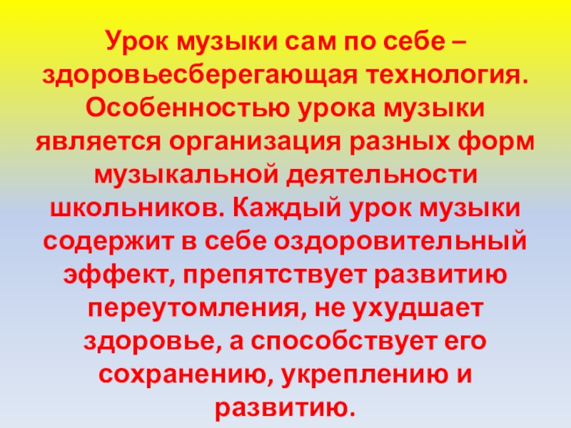 Слайд 27Урок музыки сам по себе – здоровьесберегающая технология. Особенностью урока музыки
