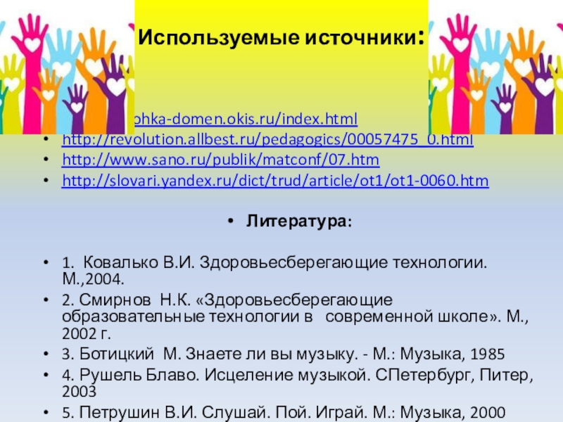 1. Ковалько В.И. Здоровьесберегающие технологии. М.,2004.