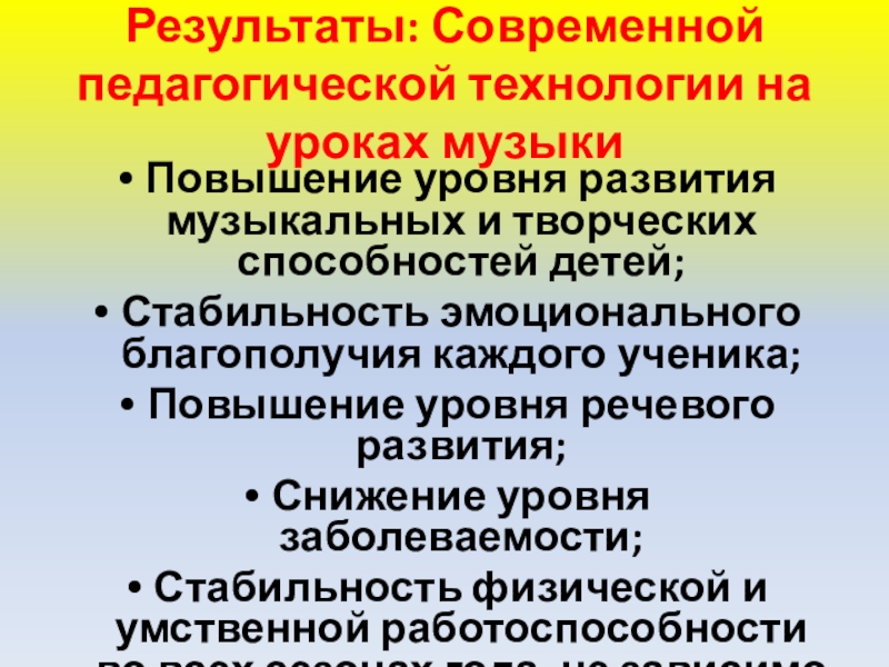 Слайд 42Результаты: Современной педагогической технологии на уроках музыки