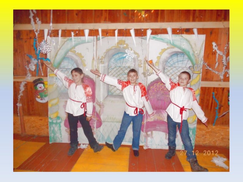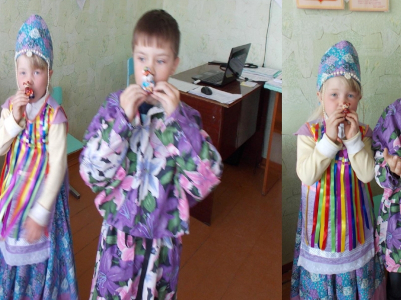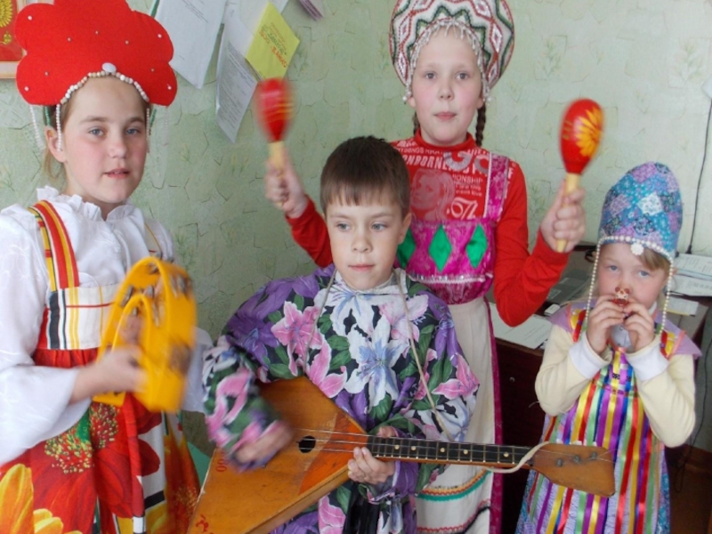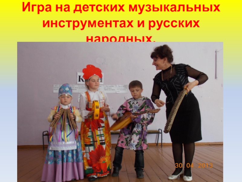 Слайд 15Игра на детских музыкальных инструментах и русских народных.