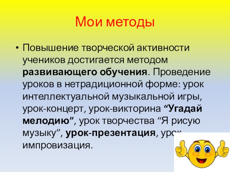 в нетрадиционной форме: урок интеллектуальной музыкальной игры, урок-концерт, урок-викторина “Угадай мелодию”, урок творчества “Я рисую музыку”, урок-презентация, урок-импровизация.