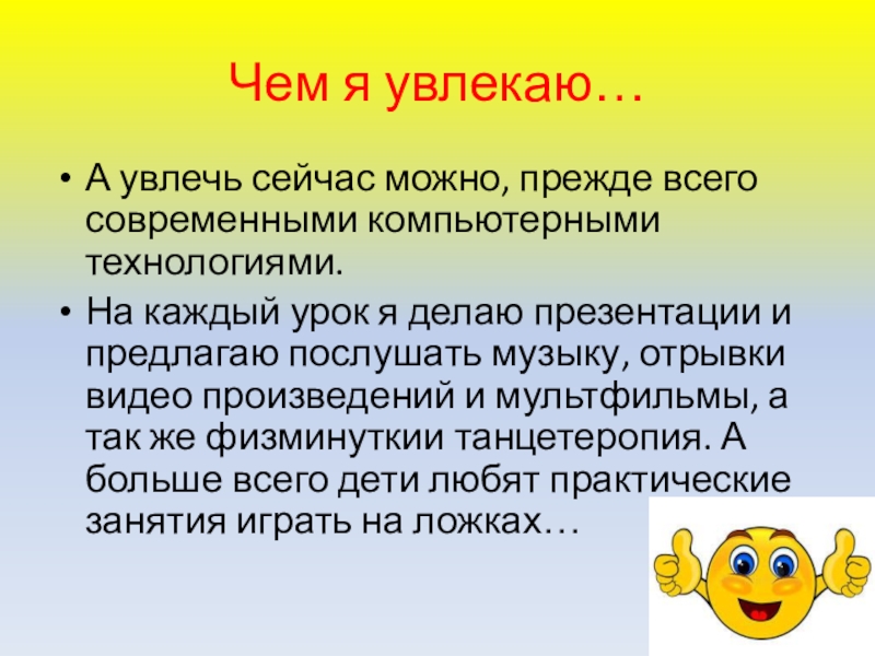 каждый урок я делаю презентации и предлагаю послушать музыку, отрывки видео произведений и мультфильмы, а так же физминуткии танцетеропия. А больше всего дети любят практические занятия играть на ложках…