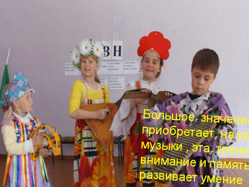 Слайд 16Большое значение приобретает, на уроках музыки , эта тренирует внимание и