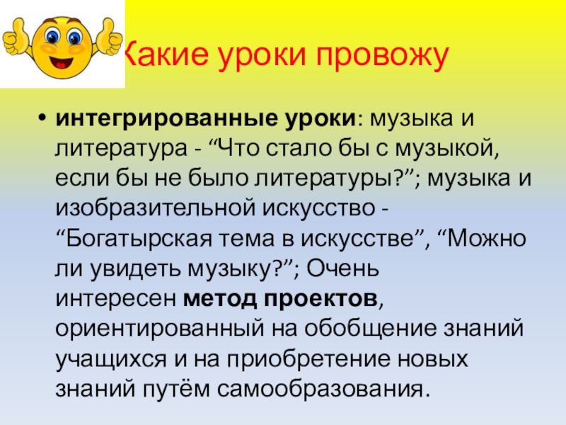 с музыкой, если бы не было литературы?”; музыка и изобразительной искусство - “Богатырская тема в искусстве”, “Можно ли увидеть музыку?”; Очень интересен метод проектов, ориентированный на обобщение знаний учащихся и на приобретение новых знаний путём самообразования.