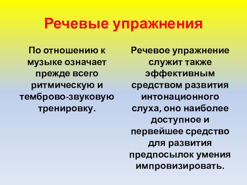 Речевое упражнение служит также эффективным средством развития интонационного слуха, оно наиболее доступное и первейшее средство для развития предпосылок умения импровизировать.