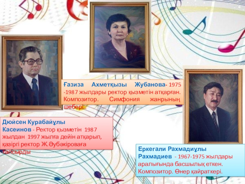 Дюйсен Курабайұлы Касеинов - Ректор қызметін 1987 жылдан 1997 жылға дейін атқарып, қазіргі ректор Ж.Әубәкіроваға тапсырды