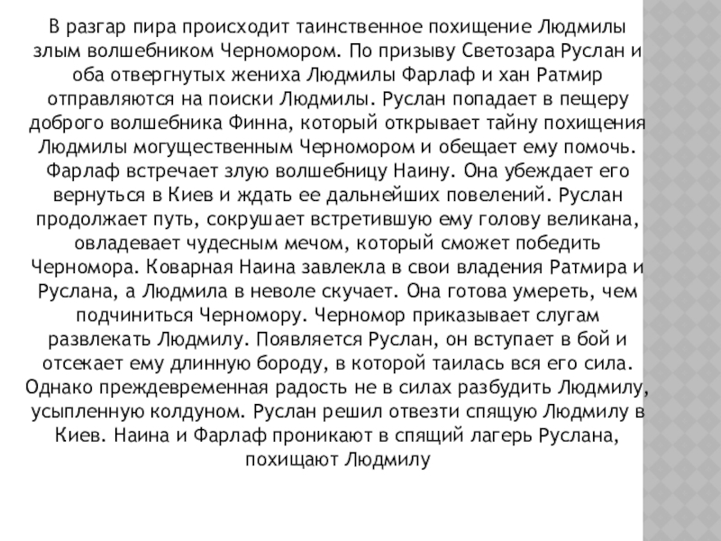 В разгар пира происходит таинственное похищение Людмилы злым волшебником Черномором. По