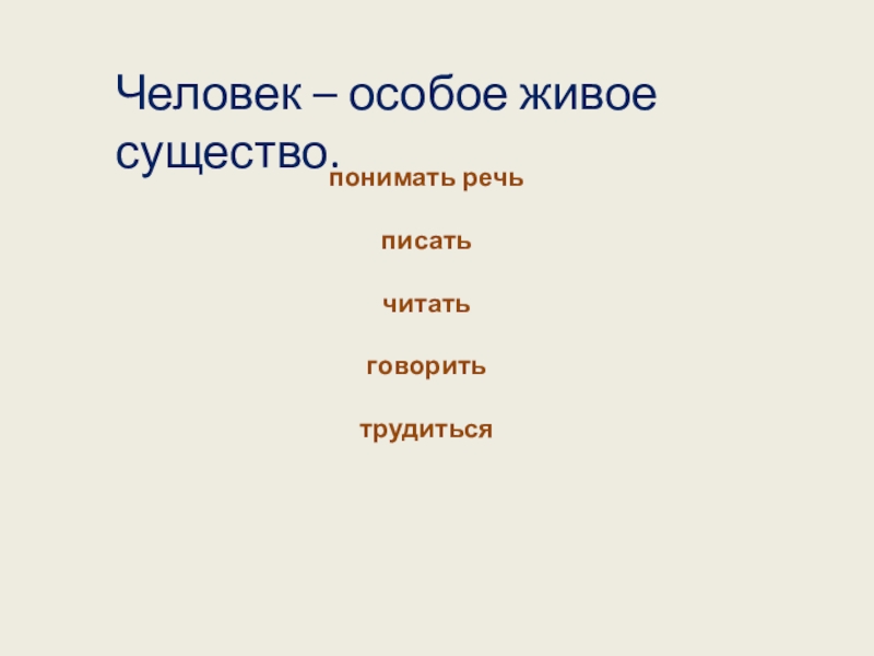 понимать речь писать читать говорить трудиться Человек – особое живое существо.