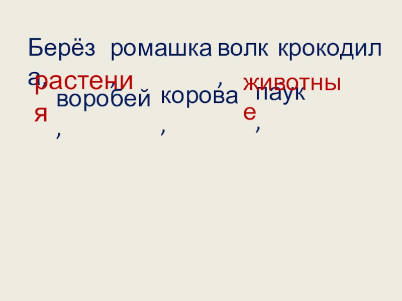 Берёза,воробей,корова,ромашка,волк,паук,крокодил.растенияживотные