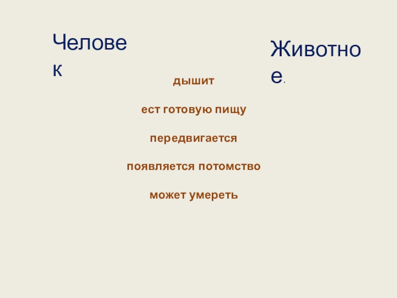 дышит ест готовую пищу передвигается появляется потомство может умереть Человек Животное.