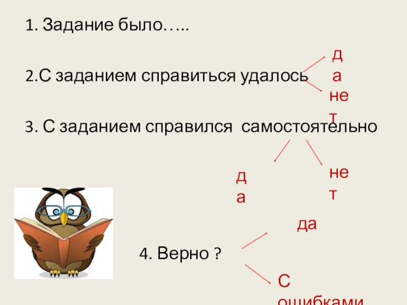 1. Задание было…..2.С заданием справиться удалось3. С заданием справился самостоятельно