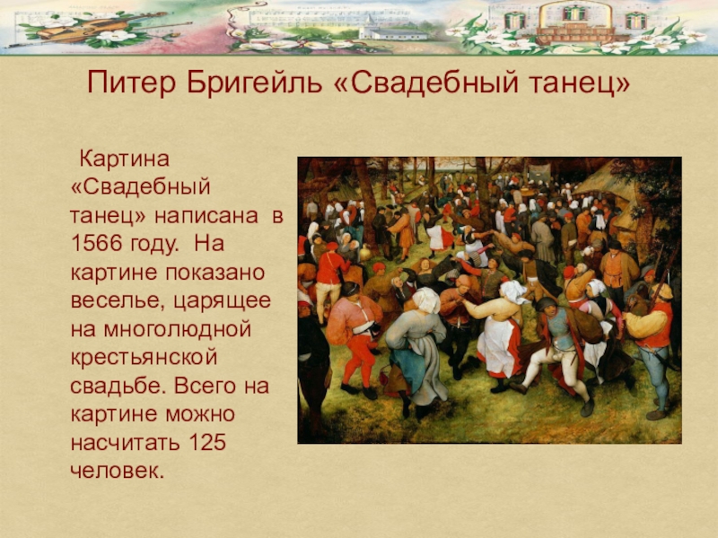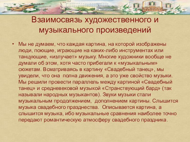 которой изображены люди, поющие, играющие на каких-либо инструментах или танцующие, «излучает» музыку. Многие художники вообще не думали об этом, хотя часто прибегали к «музыкальным» сюжетам. Всматриваясь в картину «Свадебный танец», мы увидели, что она полна движения, а это уже свойство музыки. Мы решили провести параллель между картиной «Свадебный танец» и средневековой музыкой «Странствующий бард» (так называли народных музыкантов). Звуки музыки стали музыкальным продолжением, дополнением картины. Слышится музыка свадебного празднества. Описывается картина, а слышится музыка, ибо музыкальные сравнения наиболее точно передают романтическую атмосферу свадебного праздника.