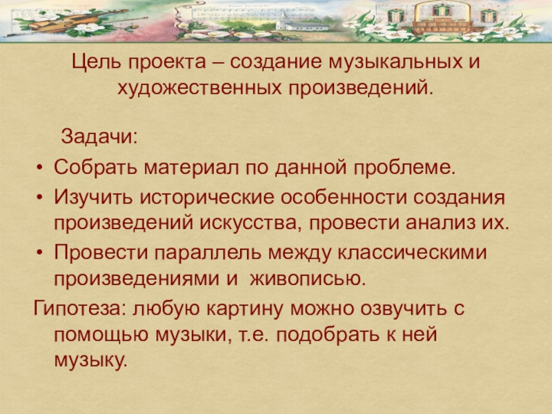 Слайд 3Цель проекта – создание музыкальных и художественных произведений.