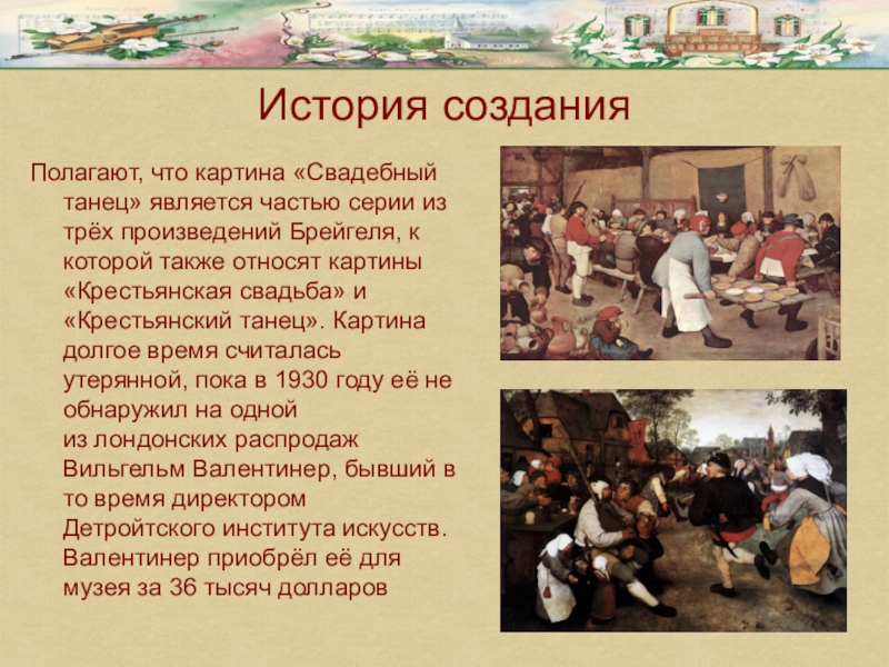 произведений Брейгеля, к которой также относят картины «Крестьянская свадьба» и «Крестьянский танец». Картина долгое время считалась утерянной, пока в 1930 году её не обнаружил на одной из лондонских распродаж Вильгельм Валентинер, бывший в то время директором Детройтского института искусств. Валентинер приобрёл её для музея за 36 тысяч долларов