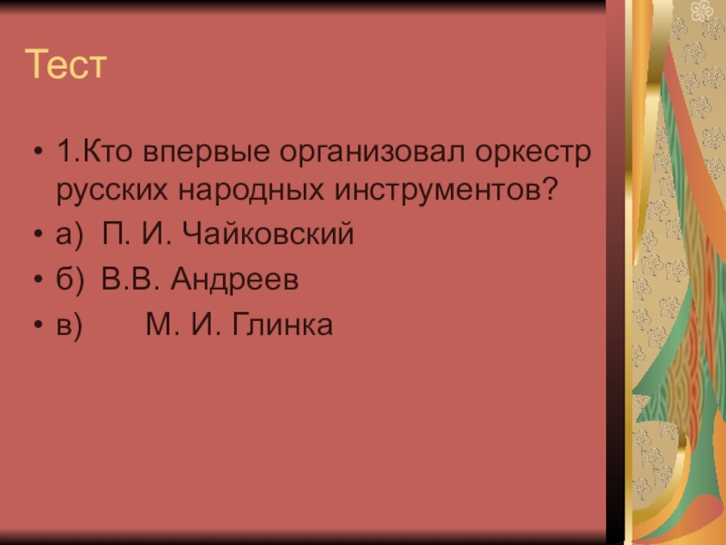 Тест1.Кто впервые организовал оркестр русских народных инструментов?а)	П. И. Чайковскийб)	В.В. Андреевв)    М. И. Глинка