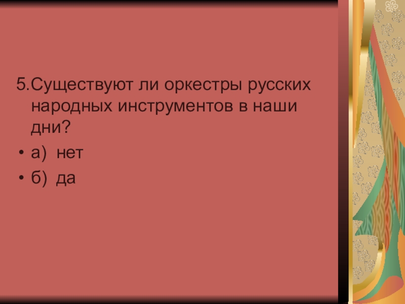 5.Существуют ли оркестры русских народных инструментов в наши дни?а)	нетб)	да