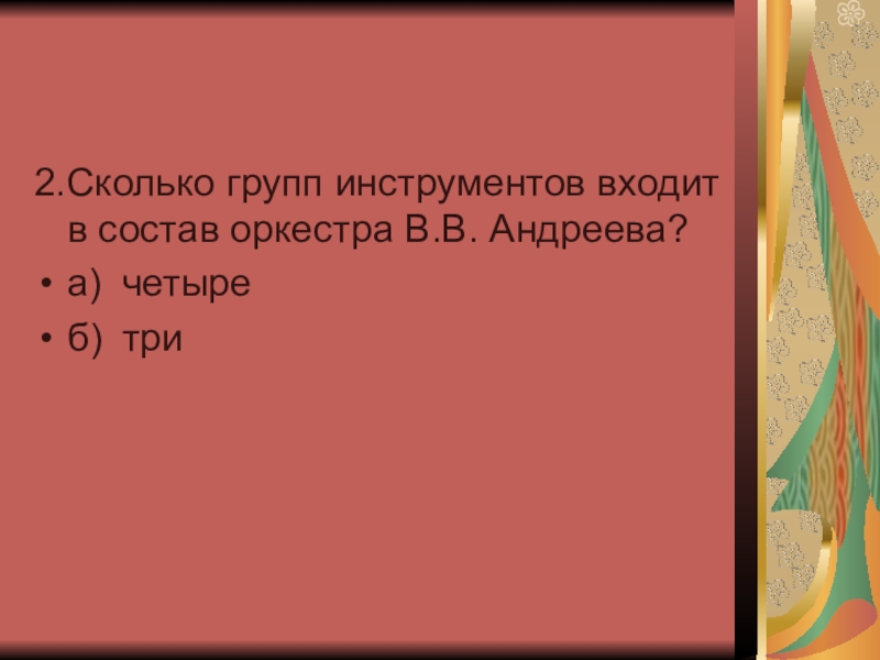 2.Сколько групп инструментов входит в состав оркестра В.В. Андреева?а)	четыреб)	три