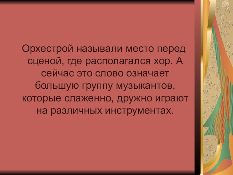 Орхестрой называли место перед сценой, где располагался хор. А сейчас это слово означает большую группу музыкантов, которые слаженно, дружно играют на различных инструментах.