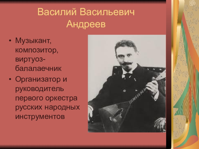 Василий Васильевич АндреевМузыкант, композитор, виртуоз-балалаечникОрганизатор и руководитель первого оркестра русских народных инструментов