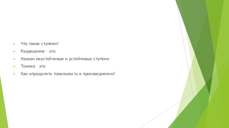 Что такое ступени?Разрешение – этоНазови неустойчивые и устойчивые ступениТоника – этоКак определить тональность в произведнении?