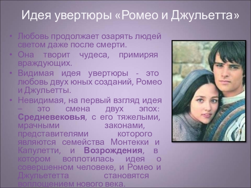 Идея увертюры «Ромео и Джульетта»Любовь продолжает озарять людей светом даже после смерти.Она творит чудеса, примиряя враждующих.Видимая идея