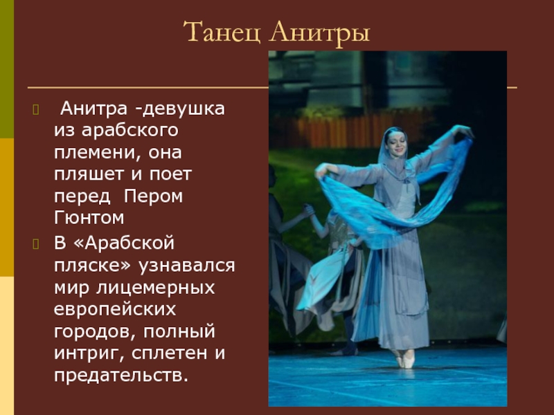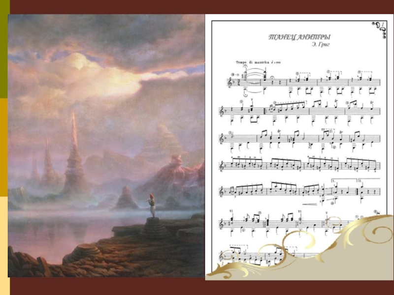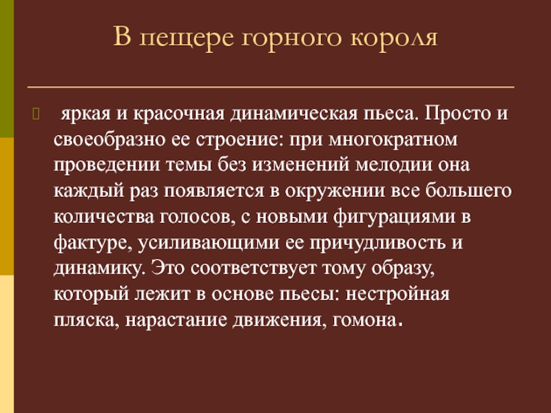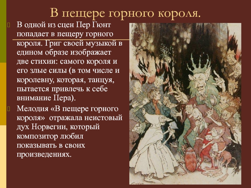 пещеру горного короля. Григ своей музыкой в едином образе изображает две стихии: самого короля и его злые силы (в том числе и королевну, которая, танцуя, пытается привлечь к себе внимание Пера).