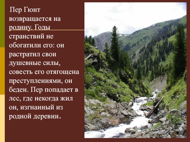 его: он растратил свои душевные силы, совесть его отягощена преступлениями, он беден. Пер попадает в лес, где некогда жил он, изгнанный из родной деревни.