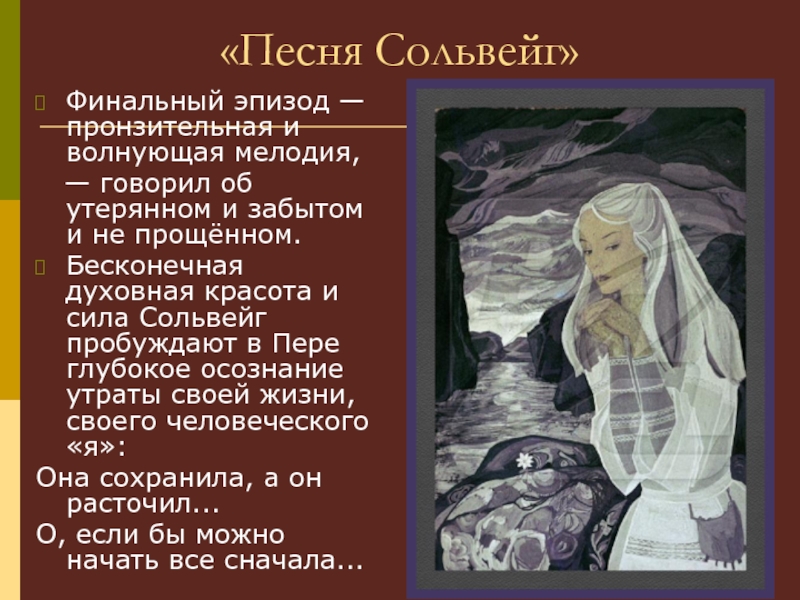 Бесконечная духовная красота и сила Сольвейг пробуждают в Пере глубокое осознание утраты своей жизни, своего человеческого «я»: