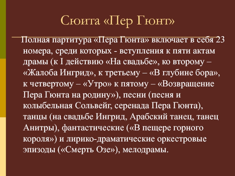23 номера, среди которых - вступления к пяти актам драмы (к I действию «На свадьбе», ко второму – «Жалоба Ингрид», к третьему – «В глубине бора», к четвертому – «Утро» к пятому – «Возвращение Пера Гюнта на родину»), песни (песня и колыбельная Сольвейг, серенада Пера Гюнта), танцы (на свадьбе Ингрид, Арабский танец, танец Анитры), фантастические («В пещере горного короля») и лирико-драматические оркестровые эпизоды («Смерть Озе»), мелодрамы.