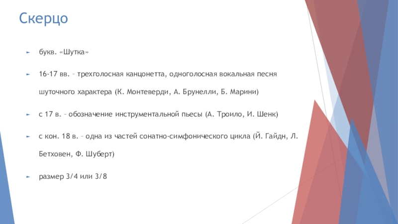 Скерцобукв. «Шутка»16-17 вв. – трехголосная канцонетта, одноголосная вокальная песня шуточного характера (К. Монтеверди, А. Брунелли, Б. Марини)с 17 в. – обозначение инструментальной пьесы (А. Троило, И. Шенк)с кон. 18 в. – одна из частей сонатно-симфонического цикла