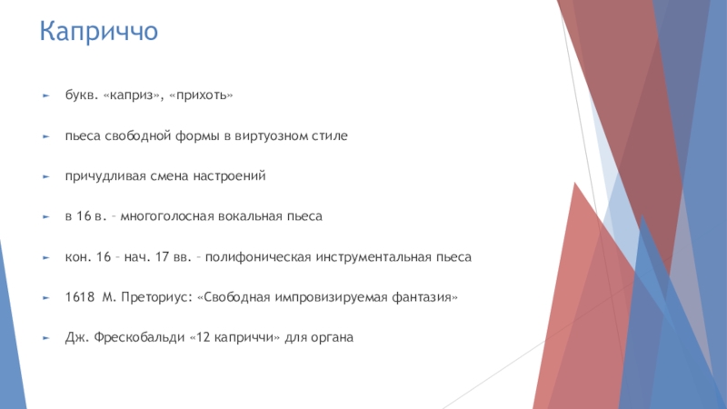 Каприччобукв. «каприз», «прихоть»пьеса свободной формы в виртуозном стилепричудливая смена настроенийв 16 в. – многоголосная вокальная пьесакон. 16