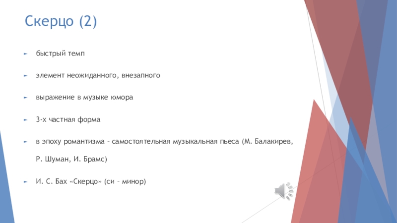 Скерцо (2)быстрый темпэлемент неожиданного, внезапноговыражение в музыке юмора3-х частная формав эпоху романтизма – самостоятельная музыкальная пьеса (М.