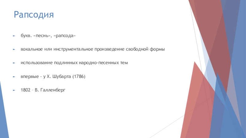 Рапсодиябукв. «песнь», «рапсода»вокальное или инструментальное произведение свободной формыиспользование подлинных народно-песенных темвпервые - у Х. Шубарта (1786)1802 –