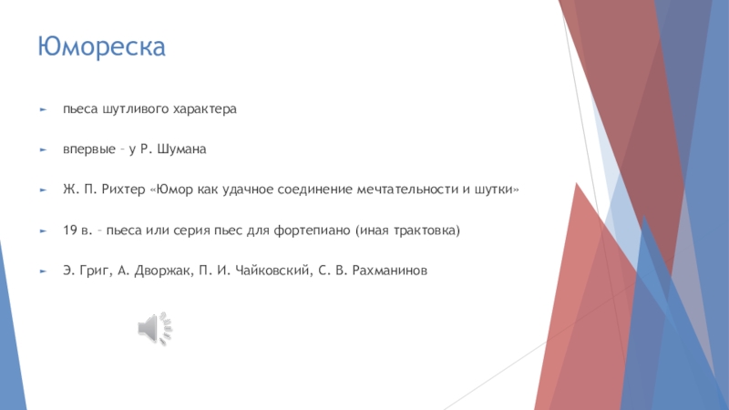 Юморескапьеса шутливого характеравпервые – у Р. Шумана Ж. П. Рихтер «Юмор как удачное соединение мечтательности и шутки»
