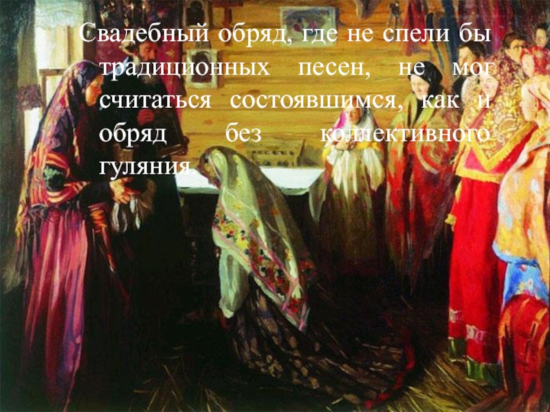 Слайд 3Свадебный обряд, где не спели бы традиционных песен, не мог считаться