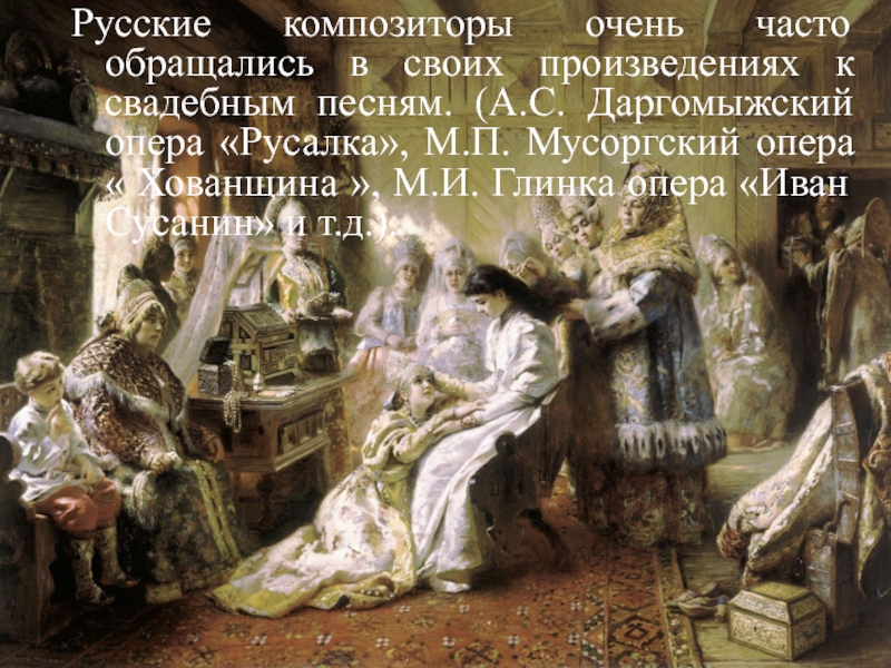 Слайд 5Русские композиторы очень часто обращались в своих произведениях к свадебным песням.