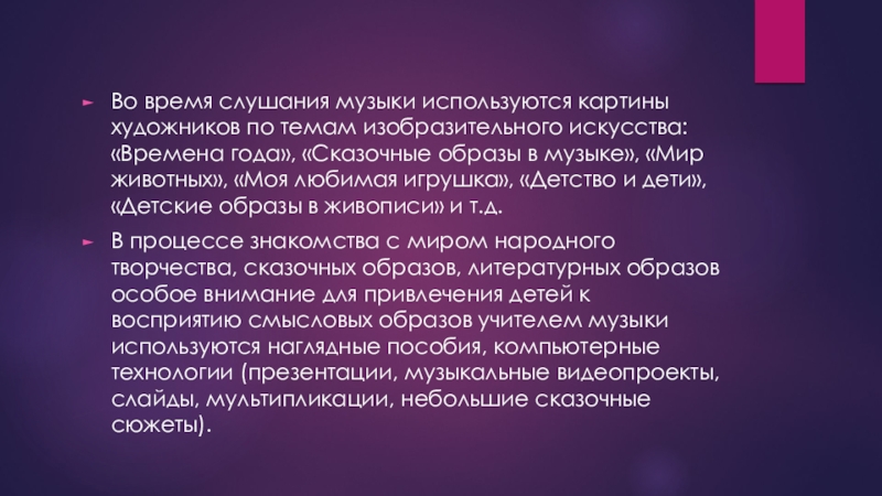 В процессе знакомства с миром народного творчества, сказочных образов, литературных образов особое внимание для привлечения детей к восприятию смысловых образов учителем музыки используются наглядные пособия, компьютерные технологии (презентации, музыкальные видеопроекты, слайды, мультипликации, небольшие сказочные сюжеты).