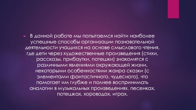 деятельности учащихся на основе смыслового чтения, где дети через художественные произведения (стихи, рассказы, прибаутки, потешки) знакомятся с различными явлениями окружающей жизни, некоторыми особенностями жанра сказки (с элементами фантастичного, чудесного), что помогает им глубже и полнее воспринимать аналогии в музыкальных произведениях, песенках, потешках, хороводах, играх.
