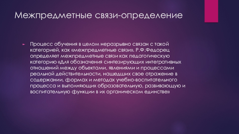 «межпредметные связи». Р.Ф.Федорец определяет межпредметные связи как педагогическую категорию «Для обозначения синтезирующих интегративных отношений между объектами, явлениями и процессами реальной действительности, нашедших свое отражение в содержании, формах и методах учебно-воспитательного процесса и выполняющих образовательную, развивающую и воспитательную функции в их органическом единстве»