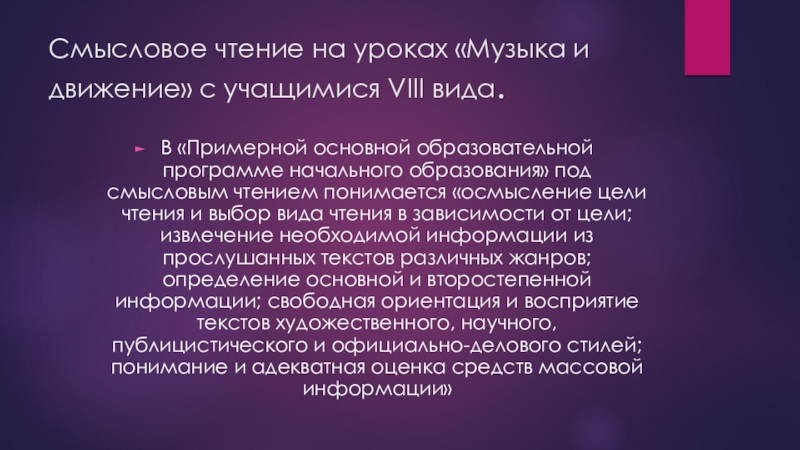 Слайд 9Смысловое чтение на уроках «Музыка и движение» с учащимися VIII вида.